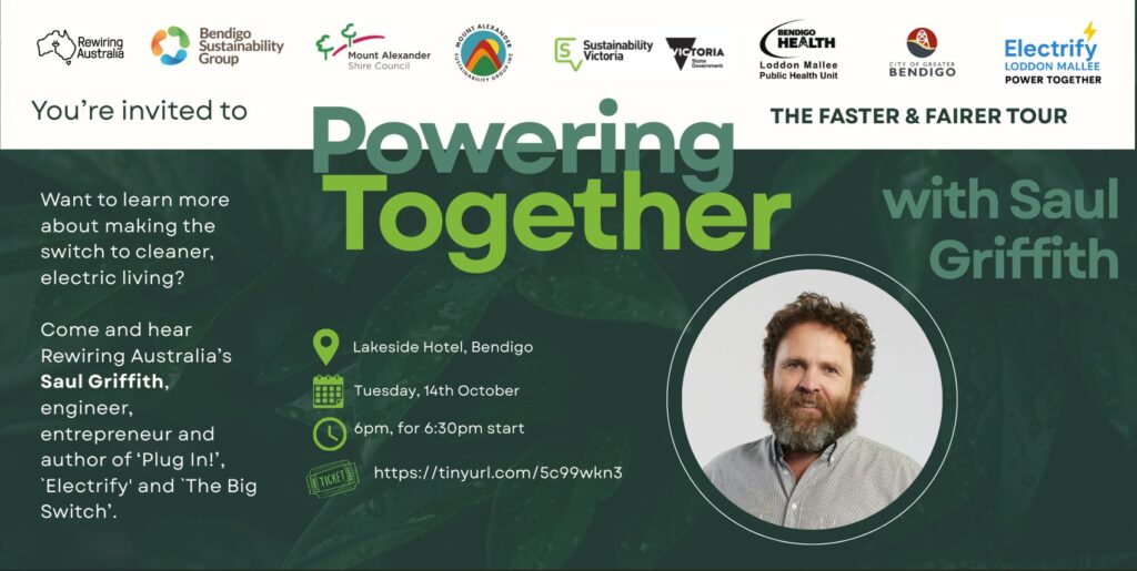 This project is supported by the Community Electrification Engagement Program. The Program is delivered by Sustainability Victoria on behalf of the Victorian Government. The Faster, Fairer – Power Together event is presented by Rewiring Australia, Mount Alexander Sustainability Group and Bendigo Sustainability Group, with support from City of Greater Bendigo.