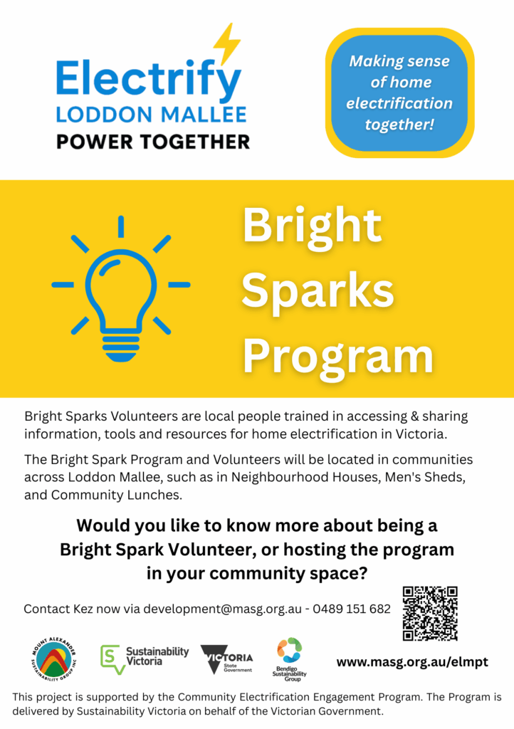A Bright Spark is a volunteer who’s been trained up in the information, tools and resources for home electrification in Victoria, and is ready to share this info with interested community members. You will find Bright Spark Volunteers in local community spaces, such as Neighbourhood Houses, Men’s Sheds, faith groups and sporting clubs, across the Loddon Mallee Region.
